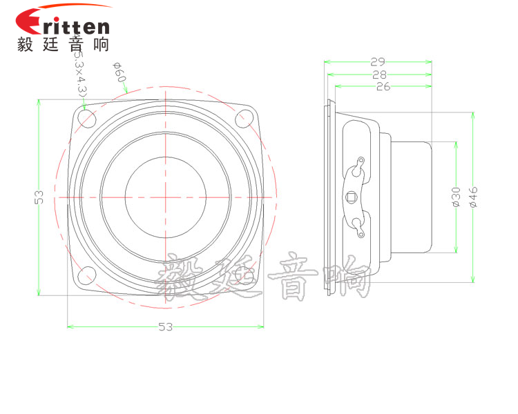 45mm方形铁盆架内磁全频喇叭,采用高性能稀土高强磁,灵敏度高,磁性强,音色清晰;