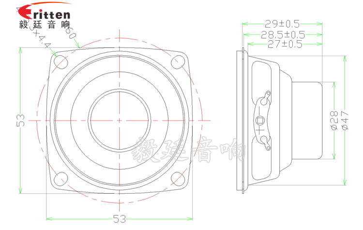 53mm方形铁盆架内磁全频喇叭,铸铁盆架,用的是优质的材料一次成型,四个超大的散热孔,散热性能好,耐冲击;