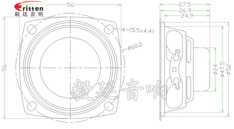 56mm异型铁盆架内磁全频喇叭,具有稳定的稀土高强磁,音色清晰、悦耳;