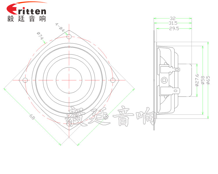 68mm异型铁盆架内磁全频喇叭,采用了性价比高的铁盆架,外观漂亮,磁钢采用了被誉为磁钢之王的钕铁硼,磁性强,动力足,永久不退磁;