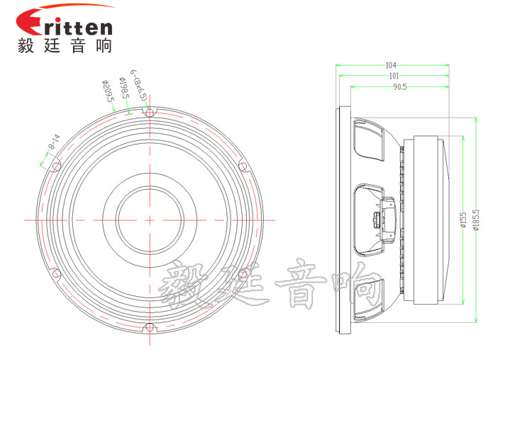 8寸圆形塑料盆架中低音喇叭,采用的是外磁,加厚高性能航天磁,音色饱满、质感强;