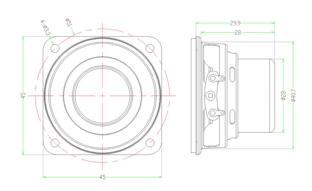 45mm方形铁盆架内磁全频喇叭,采用稀土高强磁磁钢,密度高,磁性强,使音色清晰、饱满;